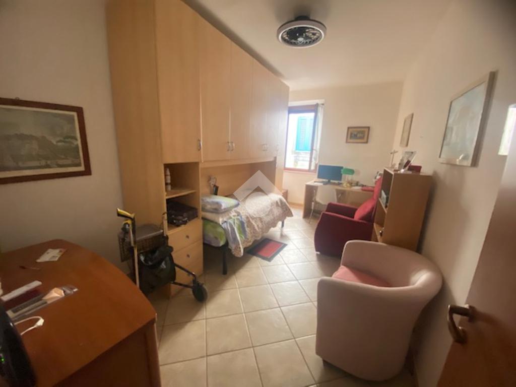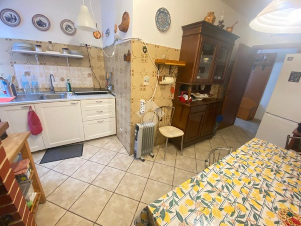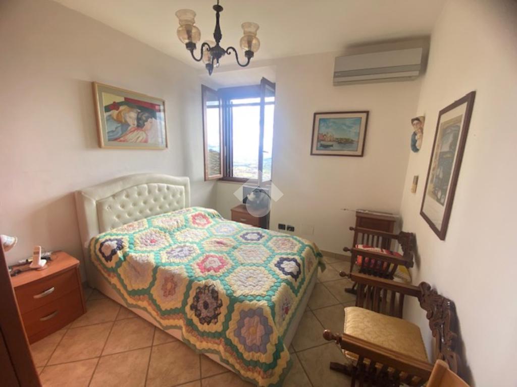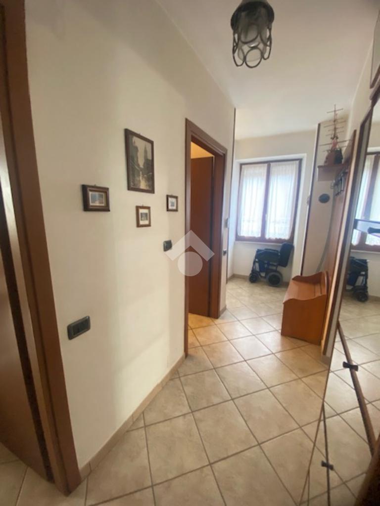 disimpegno, cucina abitabile con camino, soggiorno con splendido affaccio panoramico su Viterbo, due camere da letto, bagno con box doccia e comodo ripostiglio.